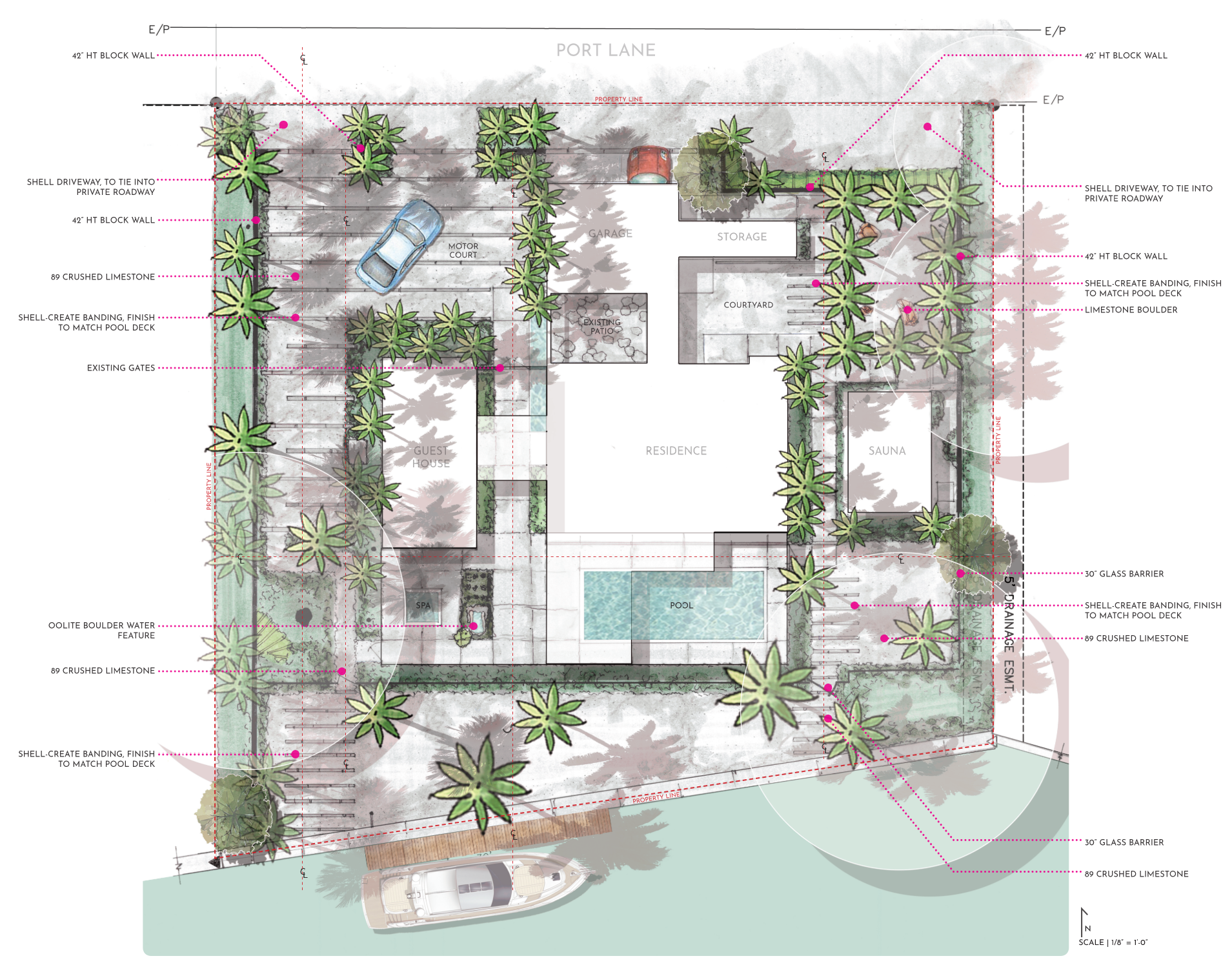 Thin concrete bands and linear elements define space without enclosure, allowing the landscape to flow seamlessly through the architecture. Organized as a series of outdoor rooms and garden vignettes, the landscape mirrors this approach, unfolding gradually through courtyards, shaded terraces, and framed views that blur the boundary between inside and out.