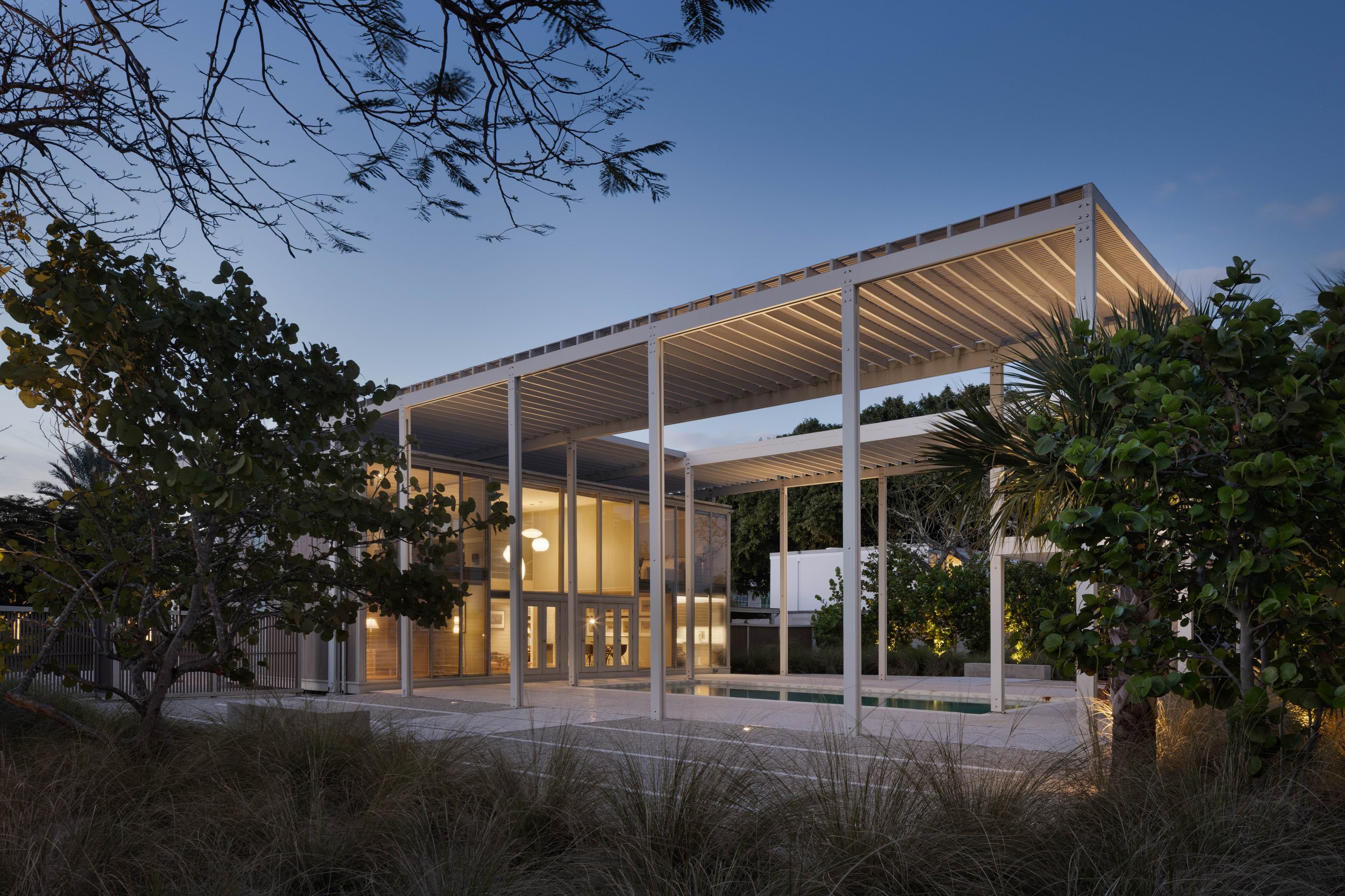 Originally designed by renowned architect Paul Rudolph in 1953, the Umbrella House stands as an enduring icon of mid-century residential architecture. In a recent commission, OLA was tasked with developing a landscape design that not only complements the home's distinctive architectural vernacular but also responds thoughtfully to South Florida’s unique coastal climate.Rooted in the principles of the Bauhaus movement, the garden is conceived as a structured and geometric composition. Its spatial organization is guided by the proportional logic of the original house and the iconic umbrella structure, which is echoed and rotated 90 degrees within the landscape design to establish harmony and spatial balance across the site. Thin concrete bands were introduced to balance the negative space within the existing concrete paving. These linear elements are conceptually derived from the slender battens of the umbrella’s architectural structure, reinforcing a visual and material continuity between the building and the landscapeThe layout of the planting beds adheres strictly to a linear geometry, reinforcing the architectural language of the residence. A palette of native plant species supports a xeriscape approach, enhancing sustainability while addressing the region’s vulnerability to storms and hurricanes. The use of indigenous materials further grounds the design in its context, creating a nuanced interplay of textures, forms, and green hues.Through the thoughtful integration of ecological sensitivity and modernist design principles, the resulting landscape offers a timeless and resilient environment that elevates and complements the architectural legacy of the Umbrella House.PROJECT TEAMArchitect | Paul Rudolph, Circa 1953Landscape Architect | Oasis Landscape ArchitectureLandscape Contractor | Coast Outdoor ServicesPhotographers | Nicholas Ferris Photography + Ryan Gamma PhotographyProject Completed | 2024PHOTO BY | RYAN GAMMA